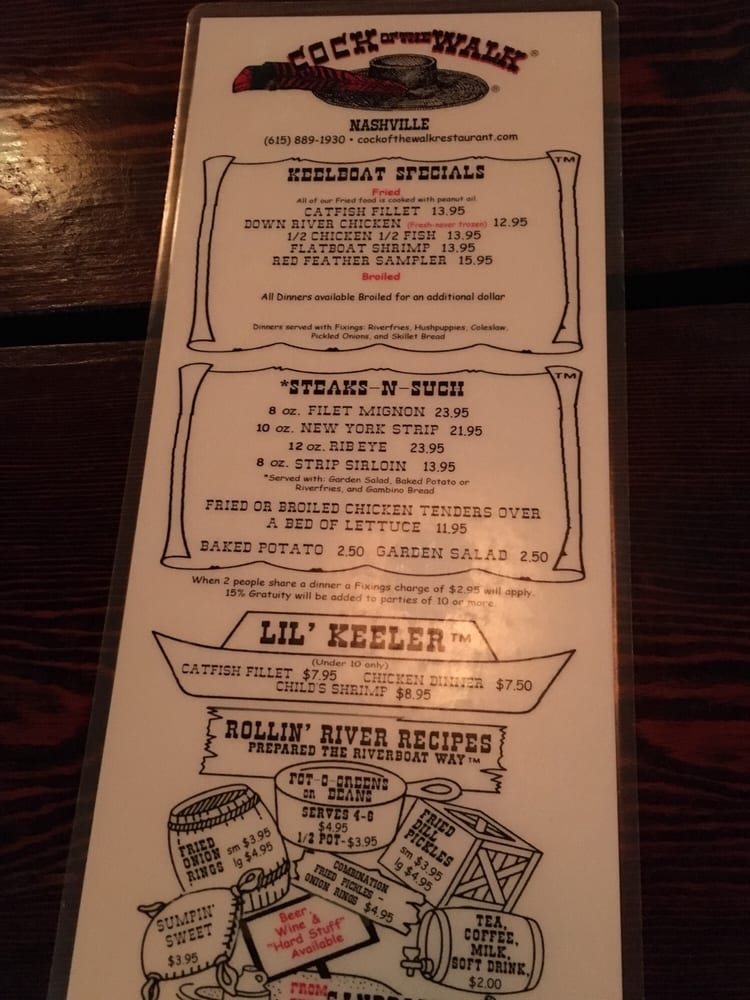 Located in Nashville, TN, Cock of the Walk is a popular American restaurant offering a range of delicious dishes. With a variety of appetizers, a la carte options, and keelboat specials, there is something for everyone to enjoy. The restaurant is known for its fried catfish and chicken, served with sides like fries, hush puppies, coleslaw, and skillet bread. Customers have praised the flavorful food and generous portions, making it a great spot for groups and families. The casual atmosphere, complete with tin cups and plates, adds to the charm of this country-style eatery. Despite some mixed reviews about customer service, overall, Cock of the Walk is a must-visit for those craving classic Southern comfort food.
